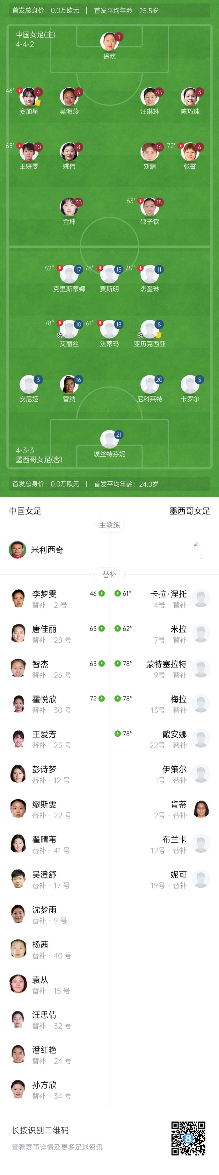 直播吧02月25日讯皮纳塔尔杯国际邀请赛第三轮比赛,中国女足vs墨西哥女足。经过90分钟较量,中国女足0-2负于墨西哥女足,以1胜1平1负的战绩结束了本届邀请赛。在前两轮邀请赛中,中国女足1-1战平加拿大女足、4-0战胜中国台北女足。